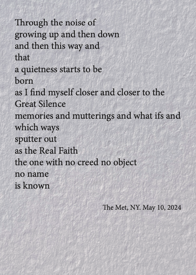 Shortly after my arrival in New York in 2022, I set up a small stand with a sign that said, “Poem Store.” I sat by the fountain beside the Metropolitan Museum of Art with a typewriter I had found in my Grandmother’s attic, listening and typing poems for anyone who stopped.